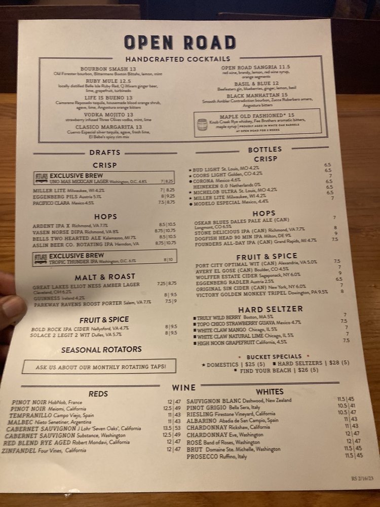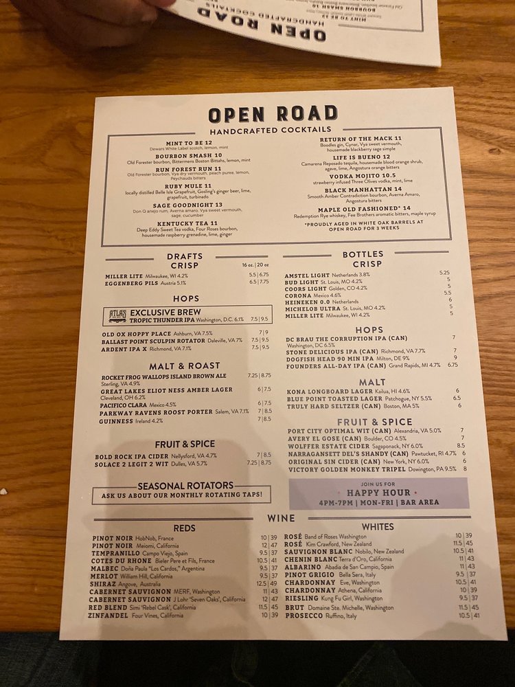 Open Road - Rosslyn offers a cozy atmosphere with dimmed lights, great service, and savory food. Customers rave about the nachos, lettuce wraps, French Onion burger, shrimp Po Boy, fried chicken sandwich, jambalaya, and bread pudding. The massive burgers and delicious fries are a must-try, and the brunch options like the all American breakfast and French toast with corn flakes are filling and flavorful. The menu features a good selection, with highlights like the grilled salmon salad and Cobb lettuce wraps. Service is generally friendly, and the indoor and outdoor seating provide a pleasant dining experience. Prices are reasonable for the area, making Open Road - Rosslyn a great choice for gatherings, brunch, or a casual meal. A standout feature is the attention to detail in food presentation and taste, making it a place worth returning to.